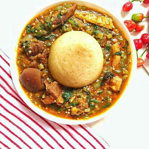 Soft eba served with rich ogbono soup made from wild mango seeds. Slippery, spicy, and satisfying.